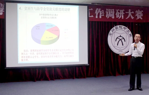 决赛现场,数学系的彭志向同学率先登台展示他的调研成果《高校贫困生认定的绩效评价报告》,他用翔实的数据对该系贫困认定工作和贫困生的在校表现情况进行分析,认为大部分贫困生勤奋励志,但也有一部分贫困生对专业技能不够重视。中文系的张钰同学则同台展示了《高校大学生家庭经济困难认定标准探析》的调研报告,她认为,应统一地区间经济困难认定标准,同时,要加强学生诚信教育,建立贫困生数据库。