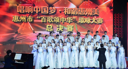 本网讯 2016年1月27日,惠州市“百歌颂中华”歌咏大赛决赛在惠州电视台演播厅举行。本次大赛由中共惠州市委宣传部、惠州市文化广电新闻出版局、惠州市文学艺术界联合会主办,惠州广电文化传播有限公司承办。我校音乐系师生在本次大赛中喜获佳绩,音乐系合唱团演唱的《掀起你的盖头来》获得群众歌会金奖、青年教师张英博演唱的《两地曲》获得歌手演唱赛铜奖、青年教师赵雨心演唱的《没有强大的祖国,哪有幸福的家》获得歌手演唱赛铜奖。