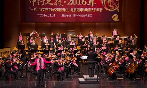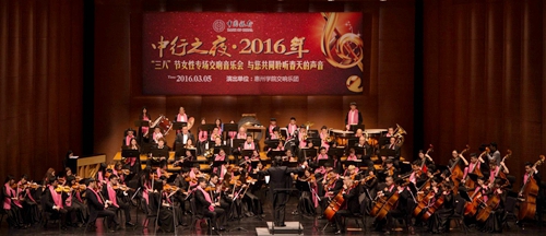 本网讯 为迎接“三八”妇女节的到来,3月5日晚,我校联合中国银行惠州分行在惠州文化艺术中心举办“三八”节女性专场交响音乐会——与您共同聆听春天的声音。我校赖美琴副校长、工会和音乐系相关负责人,中国银行惠州分行副行长张燕婷、喻谨,我校及中国银行近千名女员工代表聆听了音乐会。