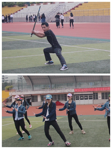 紧接着,13数学4班表演了集武术、广场舞和广播体操于一体的节目。在青春学子的感染下,全系师生纷纷环绕田径场投身“阳光跑”。