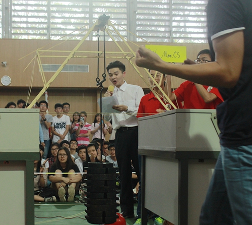 经过一个多月的精心准备,现场每支参赛队伍满怀信心地带着各自精心制作的竹桥,紧张地等待比赛加载环节。加载过程中,每当一个作品进行加载时,在场的所有成员屏气凝神,期盼着砝码的逐一增加,见证着每一步的成功加载。每当成功满载时,全场立即响起了热烈的欢呼声;当一听到竹皮桥梁承重瞬间撕裂的声响,现场参赛成员无不扼腕叹息;这无疑是一场全情投入,感受冰火两重天的激情赛场。