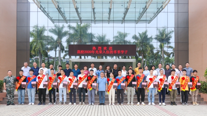 本网讯 9月4日下午,学校在行政楼前举行简朴而热烈的仪式,欢送2020年光荣入伍学生启程奔赴军营。校党委副书记、纪委书记、省监委驻惠州学院监察专员罗川山,人民武装部负责人,相关二级学院党总支书记,参军入伍学生及家长代表60余人参加了欢送仪式。仪式由人民武装部负责人主持。
