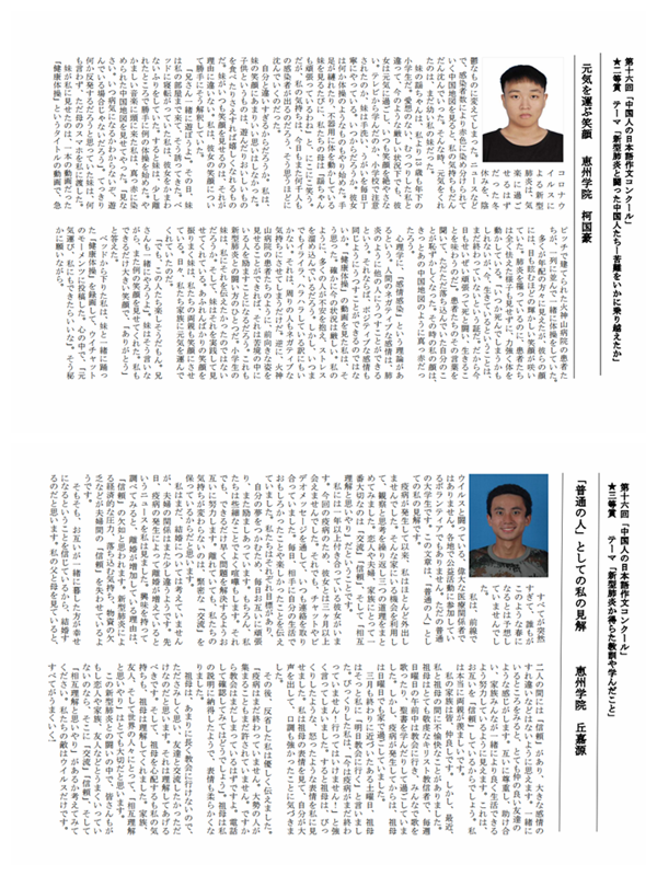 “中国日语作文大赛”是由日本侨报社和日中交流研究所主办,中日各大友好交流团体协办,旨在促进中日相互理解和文化交流的友好赛事,现已成为中国规模最大、知名度和权威性较高的高水平竞赛。今年大赛的主题是“抗击新型冠状病毒感染斗争的中国人民——如何打赢疫情防控阻击战”、“新型冠状病毒感染带来教训和学到的东西”与“想传达谢意——对日本和世界给与的援助”。据悉,大赛共收到了来自全国27个省市自治区的180多所大学共计3438篇投稿。经过初审、复审及口述审查,最终评选出特等奖1名、一等奖5名、二等奖15名、三等奖50名和佳作奖100名。