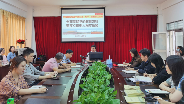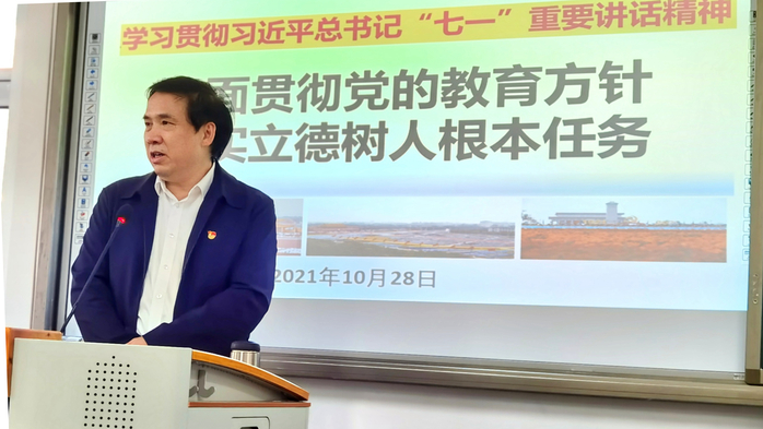 刘国栋指出,习近平总书记在庆祝中国共产党成立100周年大会上的重要讲话精神是国家面向未来发展的政治宣言、纲领性文献及行动指南,他以“政治三力”“伟大成就”“建党精神”“发出号召”“九个必须”“寄语青年”“教育方针”“立德树人”等关键词,引导大家深刻学习领悟习近平总书记“七一”重要讲话精神的重大意义,即“一个主题”:实现中华民族伟大复兴。刘国栋将党的教育方针的演变史贯穿于党的百年奋斗光辉历程中进行了详细阐述。他强调,全体教师要牢记“为中国人民谋幸福、为中华民族谋复兴”的初心与使命,要把习近平总书记“七一”重要讲话精神和教师“立德树人”根本任务紧紧结合起来,在“两个大计”的引领下、“九个坚持”的指引下、“政社校家”的联合下、“风清气正”的环境下、“全民学习”的背景下,要“敏听力、下猛力、上真力、聚合力、出实力”,真正做到为党育人、为国育才,深入学习、融会贯通,做学生成长成才的引路人。“撸起袖子加油干!”刘国栋引用习近平总书记2017年新年贺词中的内容,勉励全体教师以张桂梅、黄大年、王红旭等为榜样,争做新时代“四有”好老师。